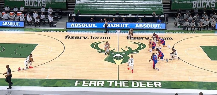 此前凯尔特人和热火已经就此事进行了抗议,雄鹿和活塞也用自己的方式进行了抗议,跳球之后先是雄鹿队拿到球权,字母哥拿到球权后双方球员全部跪地抗议,字母哥随后将球扔出场外,随后活塞拿到球权后,双方球员再次跪地抗议,活塞也将球扔出界外,随后双方才继续比赛。