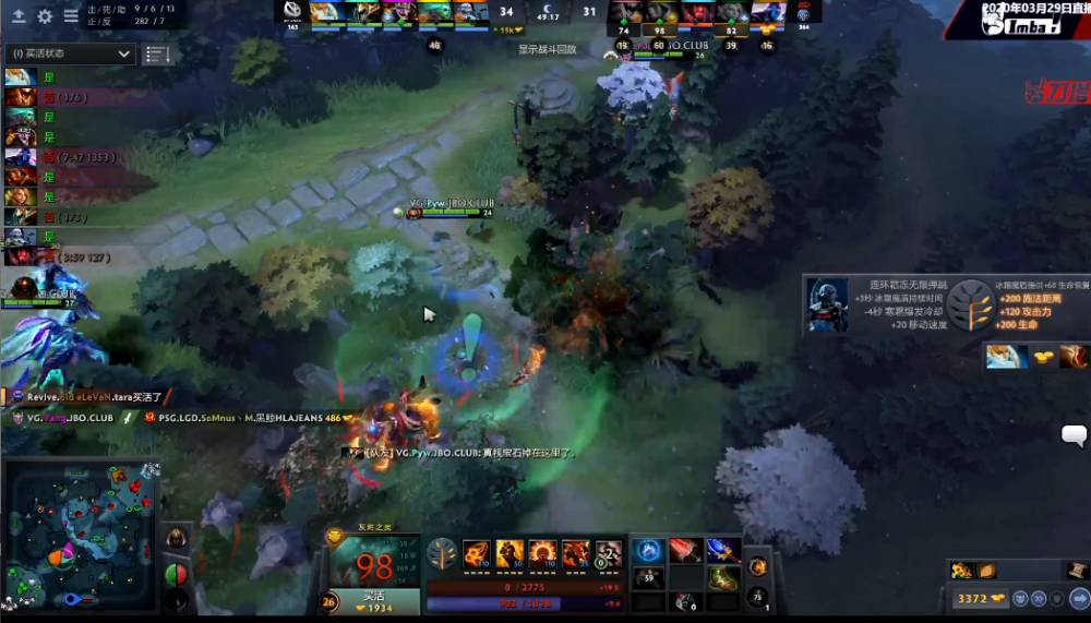 小鱼人、龙骑双双拿到BKB;VG四人开雾进入上半野区抓死了风行后LGD支援没能留到人;