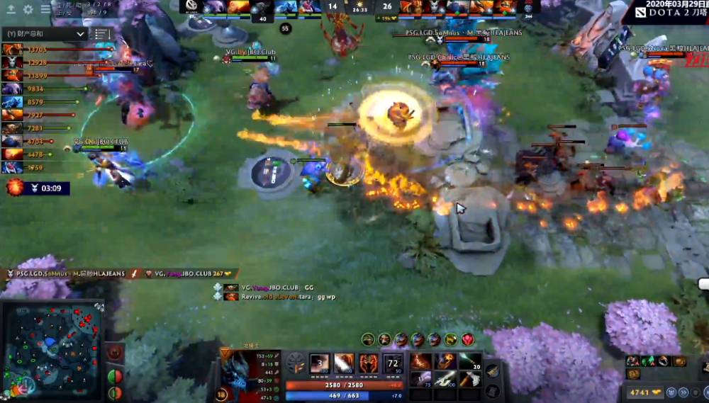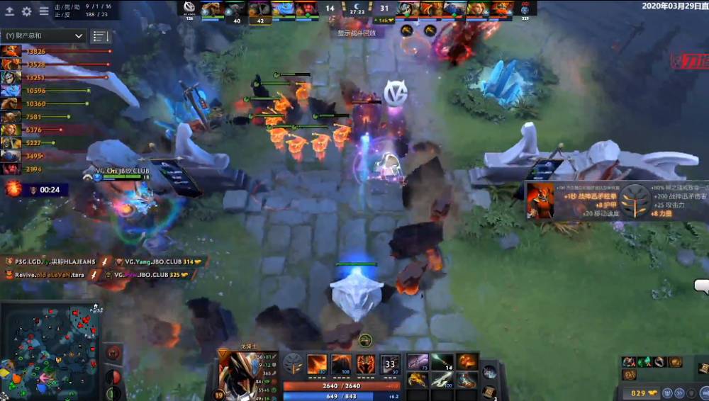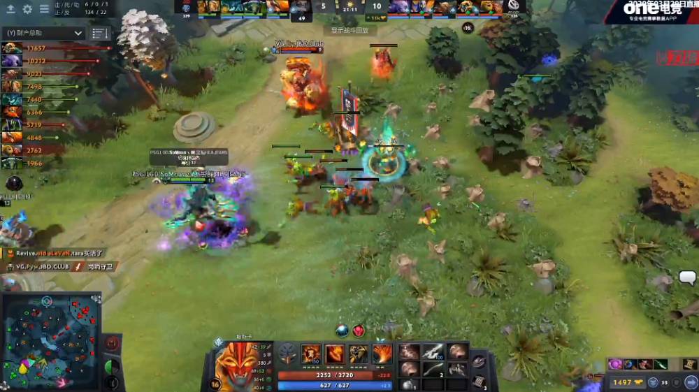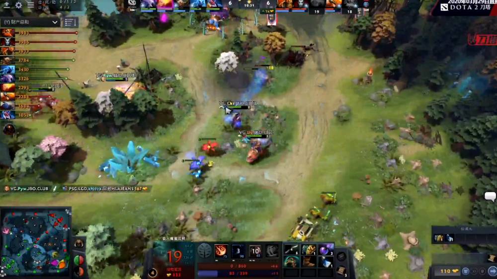十九分钟VG四人开雾进野区被人马破雾;上路龙骑隐身留人,虚空将大招单罩龙骑又被花仙子恐吓,LGD直接反打将蓝胖和全能击杀,此时LGD经济领先5K;