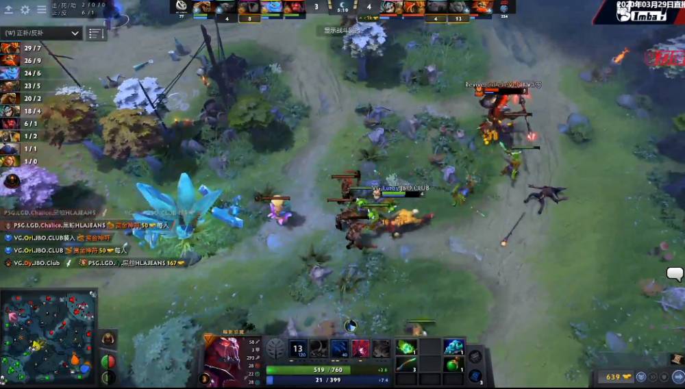二十九分钟LGD四人雾进入VG野区,占据高坡将伐木机击杀,上野区小强单人骗出了谜团的BKB;