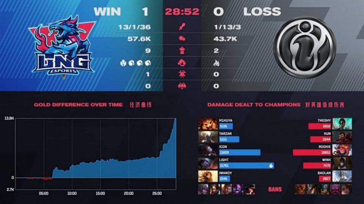 【22:50】双方中路开战,VN直接一马当先单切纳尔,LNG果断回防先杀VN。但是IG其他队员抓住机会击杀佐伊,随后发条大招拉四个,IG完成1换3。