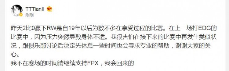 1月20日讯 刚刚,FPX打野选手Tian在个人微博上宣布将暂离赛场。