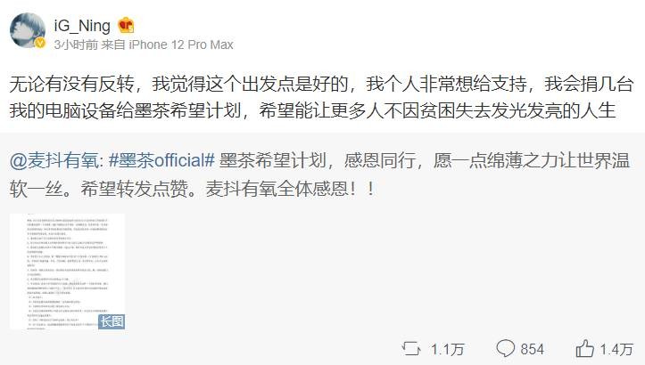 1月22日讯 今日,IG打野选手Ning在其微博上宣布将捐赠几台自己的电脑设备给墨茶希望计划并表示:“希望能让更多人不因贫困失去发光发亮的人生。”