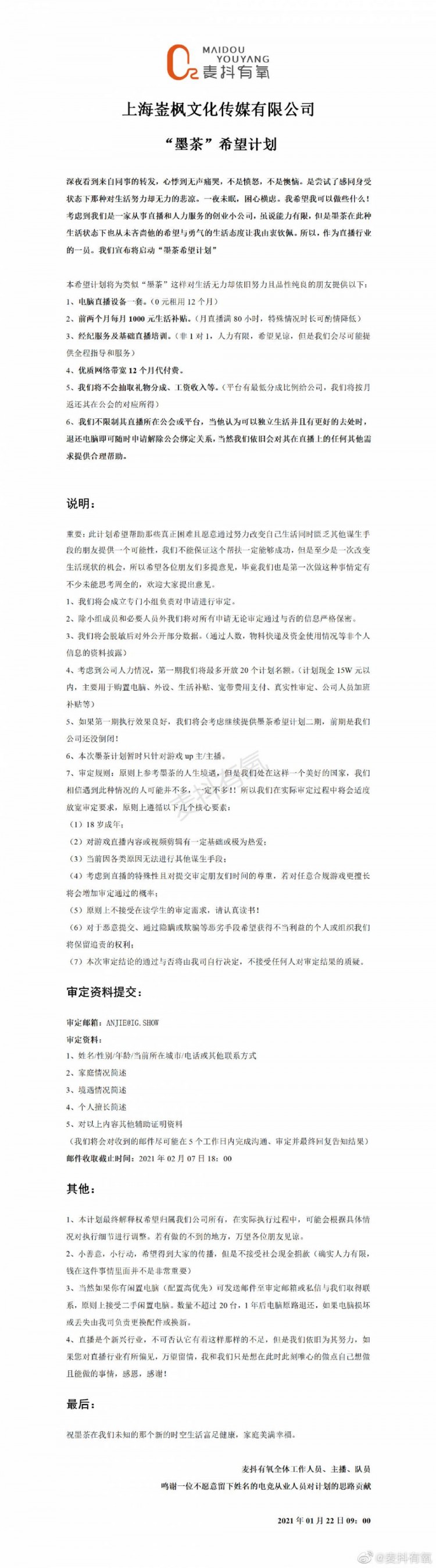 在逝世后其B站账号在生前发布乐观勇敢的生活动态感动千万网友,随后有公司正式成立墨茶希望计划,用来帮助那些真正处于苦难中原因通过努力改变生活同时缺乏谋生手段的人士提供帮助。
