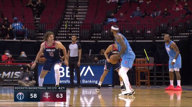 1月27日讯火箭迎战奇才,第三节考辛斯上演后撤步三分。