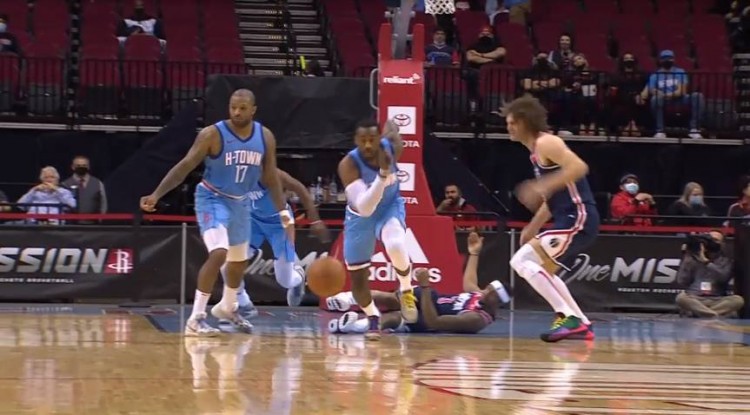 直播吧1月27日讯NBA常规赛,火箭在主场对阵奇才。第二节比赛中,奇才的一次进攻回合中,比尔持球杀到左侧面对两人夹防,皮球被老队友沃尔成功抄走,后者直接发起反击上演单手扣篮。【GIF】沃尔抢断比尔反击