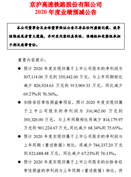 此外,京沪高铁公告显示,经财务部门初步测算,预计2020年度实现归属于上市公司股东的净利润与上年同期(重述数据)相比,将减少74.43亿元-82.27亿元,同比减少67.25%-74.33%。