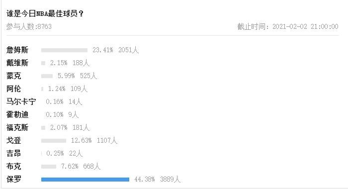 最终,保罗拿到30%的主播选票,以及44.38%的吧友选票,当选今日最佳!