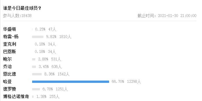 最终,哈登拿到30%的主播选票和66.7%的吧友选票,无悬念当选今日最佳!