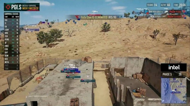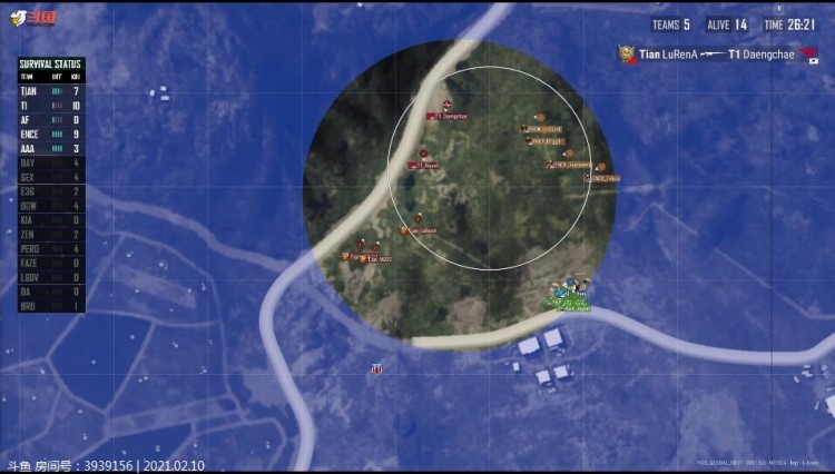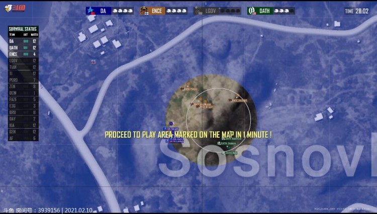 DA开始进圈,被T1打掉一人。再被FaZe打掉一人,太惨了,只剩最后一人。