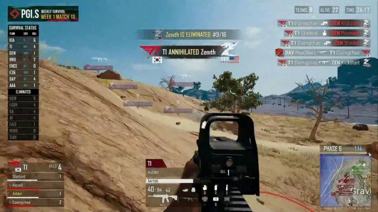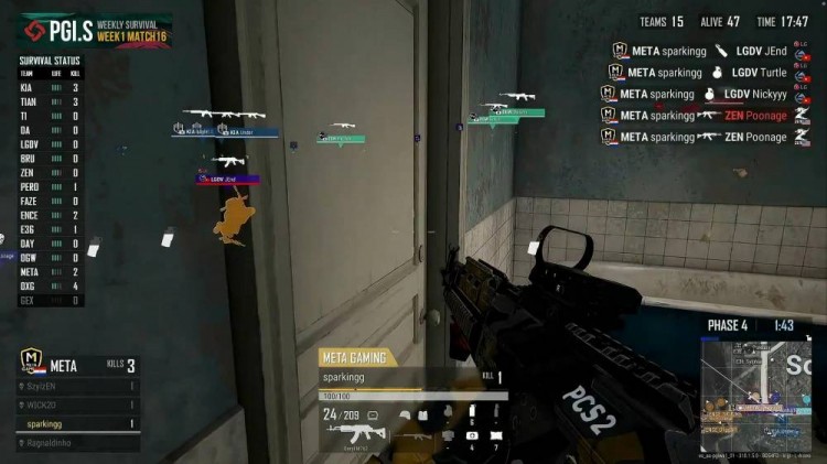 Tianba遭遇ZEN,双方各自击倒一人,Mingzi被拉起,T1远点枪线淘汰ZEN一人,T1持续打击,将ZEN打至只剩一人。