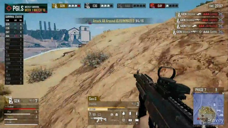 E36向北突进,找到GEN东边高点,同时GEN拉起倒地一人。