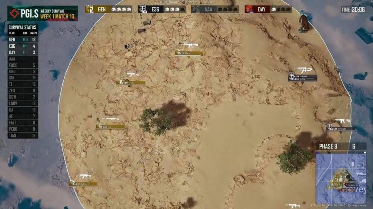 DAY独狼被GEN发现,被打残,E36绕道GEN侧边反斜,E36收掉DAY独狼,GEN loki先行击倒E36一人,GEN直接反扑,成功团灭E36,GEN成功晋级。
