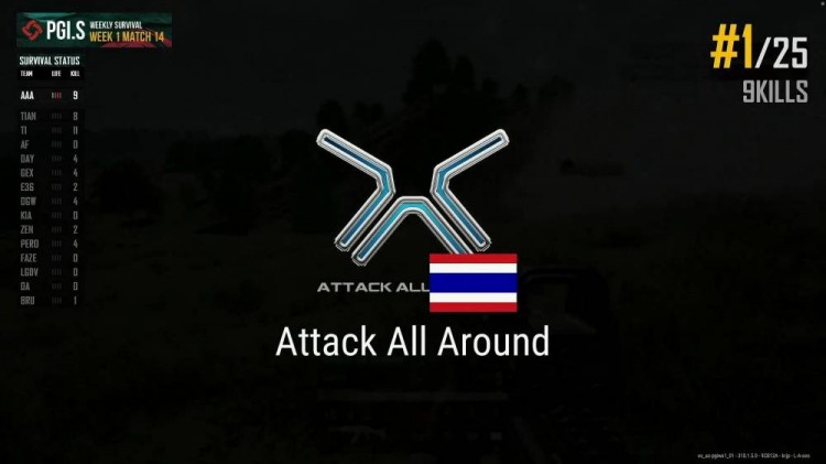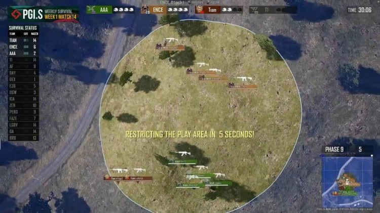 Luren被ENCE发现,死亡,只剩Mingz一人在圈边,也被淘汰,AAA、ENCE对枪,AAA成功淘汰ENCE吃鸡晋级。