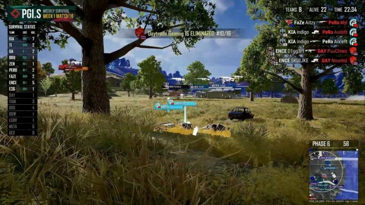 DAY开车贴BRU一人近点,被BRU直接击杀两人,DAY其他两人赶到,收下BRU一人。