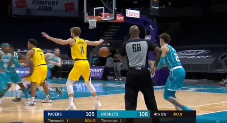 比赛末节最后时刻,领先3分的黄蜂在前场发球,此时比赛还剩0.9秒结束,步行者如果在此球发出后直接抢到球,则还能利用暂停机会布置最后一攻。