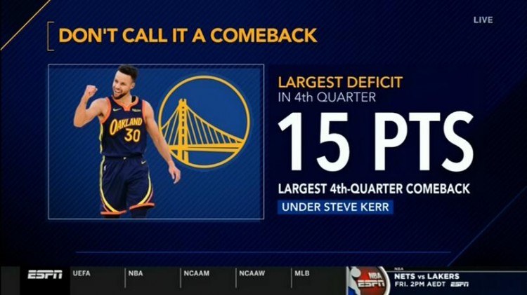 最后一节,勇士最多落后热火15分,最终经历加时实现翻盘,为科尔时代勇士末节最大逆转分差纪录。