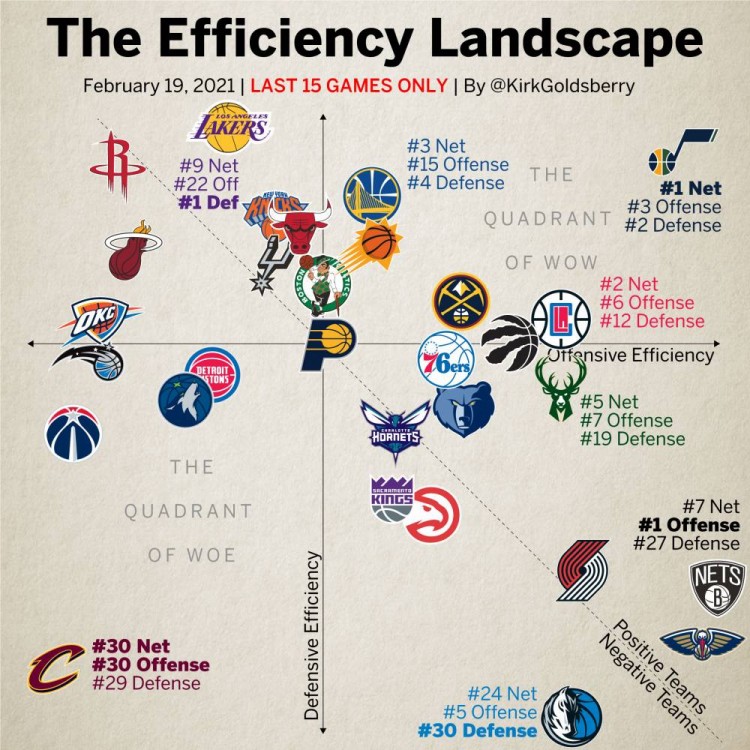 2月20日讯 勇士队今日客场挑战魔术,数据专家Kirk Goldsberry晒出了过去15场比赛联盟球队的攻防效率象限图。