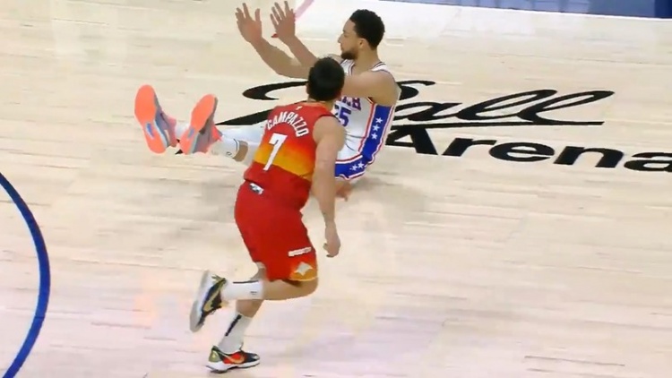 直播吧3月31日讯掘金今日在主场轻取76人。比赛中,本西在一次挡拆时被掘金后卫坎帕佐直接撞倒,这个片段冲上了推特热搜。今天的比赛,本西拿到11分2板3助2断,坎帕佐拿到2板1助2断1帽。GIF-坎帕佐