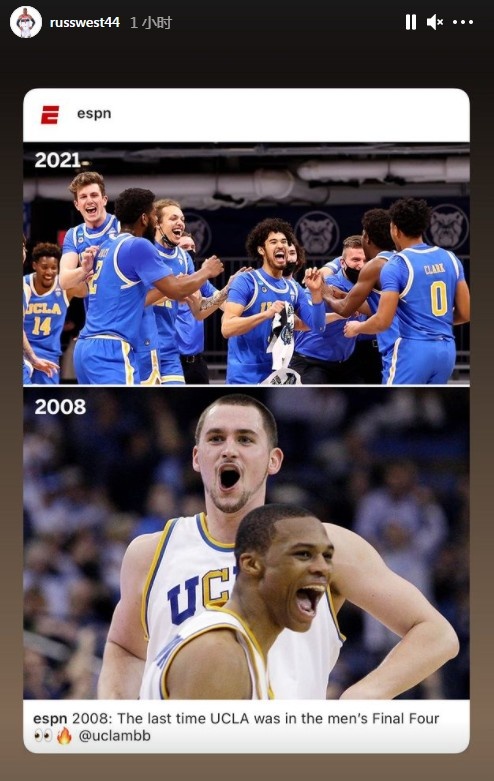 UCLA一路逆转夺得四强席位,这也是他们在2008年后首次晋级终极四强。作为当时随队闯入四强的代表人物,威少和乐福今天分别转发了母校晋级的相关新闻。