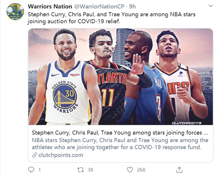 3月31日讯 据体育经纪机构Octagon的执行副总经理David Schwab透露,库里、保罗、布克、特雷-杨等NBA球员捐物参与到为抗击疫情而举办的义卖活动当中。