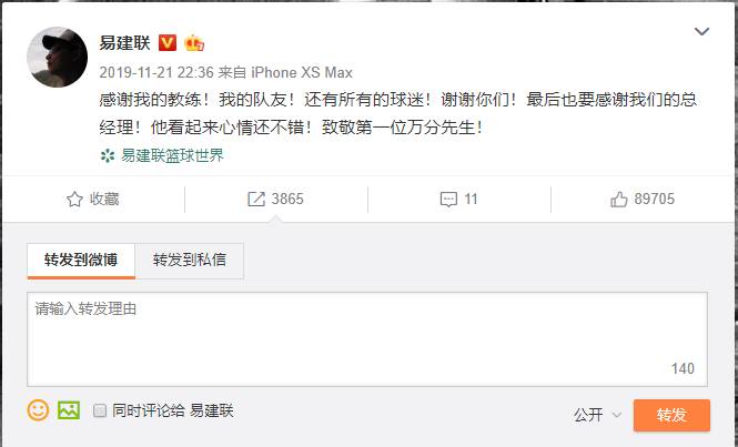 “感谢我的教练!我的队友!还有所有的球迷!谢谢你们!最后也要感谢我们的总经理!他看起来心情还不错!致敬第一位万分先生!”阿联写道。