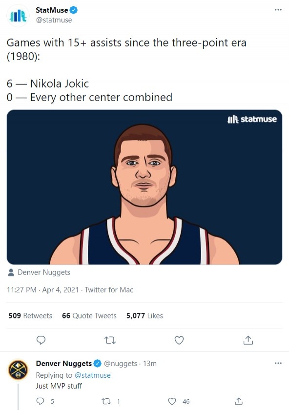 今天NBA统计网站StatMuse发布了一则推文:自NBA引入三分球以来(1980年),约基奇共6次得到15+助攻,而其他中锋合计0次。随后掘金官推在下面回复道:“MVP级别的表现”