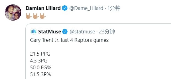 值得一提的是,特伦特的前队友利拉德转发了数据媒体StatMuse所发布的这条推特。