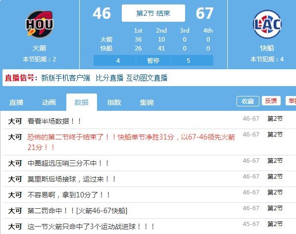 4月10日讯火箭半场46-67快船,第二节单节仅进了3个运动战进球得到10分。