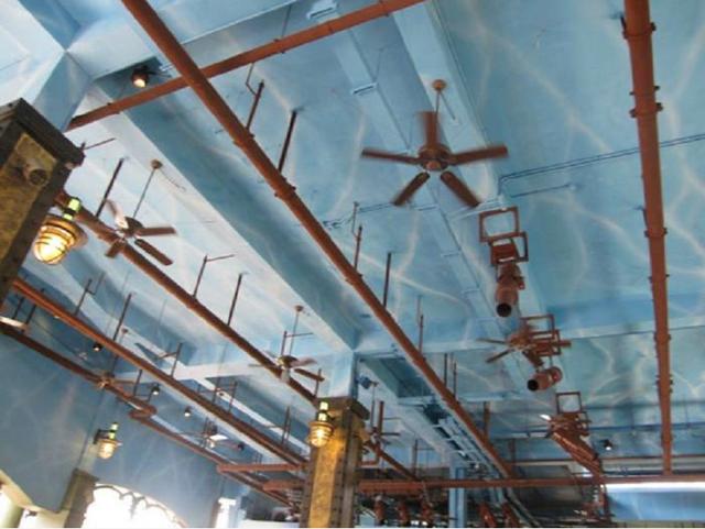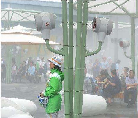 排队区通常在室内、室外两种大环境设置,而主题乐园通常全年全季营业,这就要求在冬季和夏季,排队区。虽然极端天气在一年中仅有几十天,但乐园只要在运营,就必须考虑游客的舒适性。因此,排队区常常可以看到大功率风扇,为游客降温解暑;近年来公共场所运用雾森降温越来越多,于是有些排队区也设置了风扇结合雾森的设备;冬季室外环境寒冷,设计师也会在构筑物顶棚或广场上设置有少量加热器,以维持小环境的基本温度。