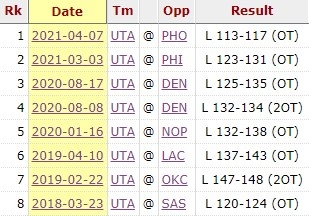 根据知名数据网站BBR的统计,2018年3月23日以来,爵士面对进入加时的比赛,已连续输掉9场(包含1场季后赛)。