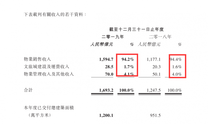 但就目前融创收入在集团中的比重来并不是太高,文旅城建设及运营收入虽然较2018年同比增长0.1%,物业管理收入及其他收入也同比增加0.1%,物业物业销售收入依然以压倒性收入占比占据集团收入的94.2%,文旅城在集团收入占比中占据1.7%份额。