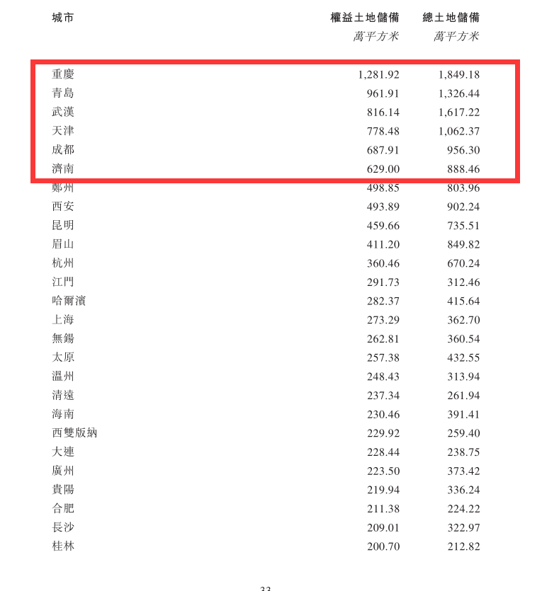 值得一提的是,集团有43个城市的销售金额排名进入当地市场前十,较2018年增加6个城市,有3个城市的销售金额超300亿元,17个城市销售金额超100亿元。风财讯发现,在土地储备方面权益储备超过600万平方米的有6个城市,分别为重庆、青岛、武汉、天津、成都、济南。