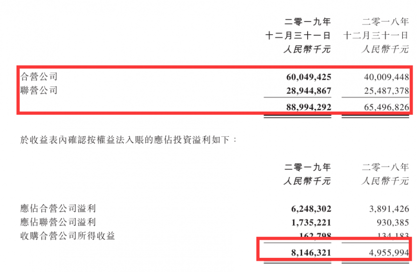 风财讯梳理其年报发现,融创中国应占合营公司溢利为62.48亿元,较2018年的38.91亿元,同比增加60.58%;应占联营公司溢利为17.35亿元,较2018年的9.30亿元同比增加86.56%;收购合营公司所得收益为1.63亿元。总共合营、联营同比增加溢利81.46亿元,相较2018年的49.56亿元,同比增加64.27%。