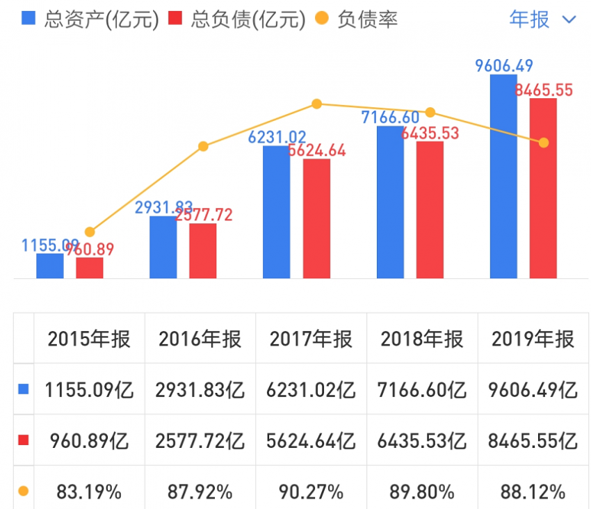 对此,融创给出的解释是,集团的利率风险主要来自长期借贷。浮息借贷使融创承受现金流量利率风险,由所持有的浮息现金部分抵消,定息借贷使集团承受公允价值利率风险,借贷总额由2018年12月31日的人民币294.1亿元增加至2019年12月31日的人民币3222.7亿元,主要由于销售物业开工面积增加、文旅城建设及营运等事项导致新增借贷有所增加,及因收购物业开发项目导致纳入合并报表的借贷增加。就负债率而言,融创2019年的负债率虽然为88.12%,但较2018年、2017年的数额有所下降。