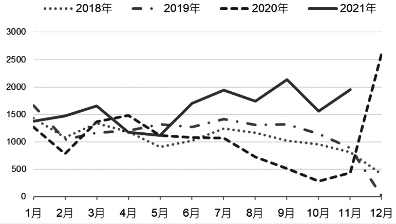图为2018—2021年中国自印尼月度煤炭进口量(单位:万吨)