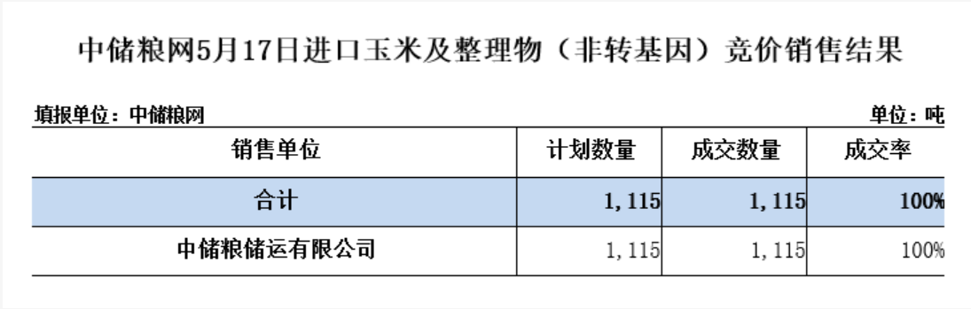 中储粮网5月17日进口玉米及整理物(非转基因)竞价销售结果