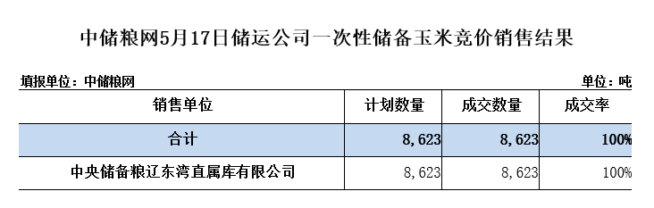 中储粮网5月17日储运公司一次性储备玉米竞价销售结果:计划数量8623吨,成交数量8623吨,成交率100%。