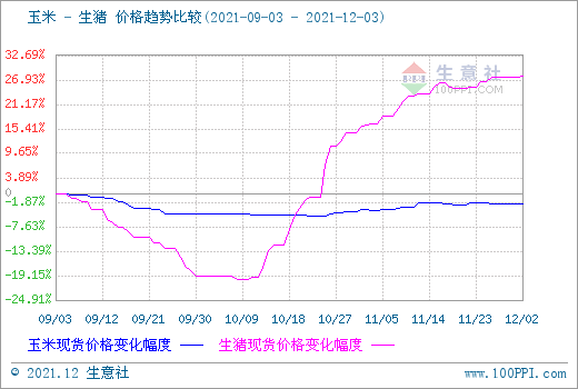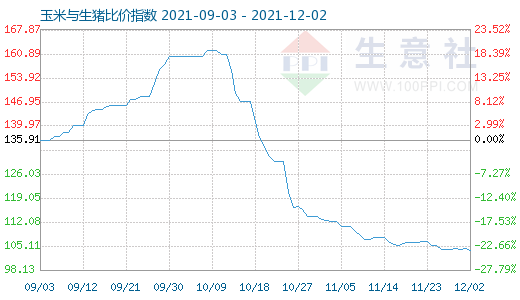 12月2日玉米与生猪商品比价指数为103.95, 较昨日下降了0.35点,较周期内最高点162.06点(2021-10-10)下降了35.86%,较2019年11月03日最低点32.61点上涨了218.77%。(注:周期指2013-01-01至今)