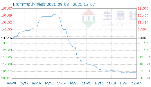 12月7日玉米与生猪商品比价指数为104.47, 较昨日上升了0.46点,较周期内最高点162.06点(2021-10-10)下降了35.54%,较2019年11月03日最低点32.61点上涨了220.36%。(注:周期指2013-01-01至今)