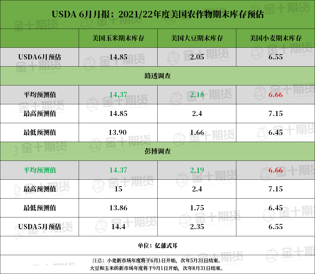 ⑦6月美国2022/2023年度玉米期末库存预期14亿蒲式耳,5月预期为13.6亿蒲式耳,环比增加0.4亿蒲式耳。