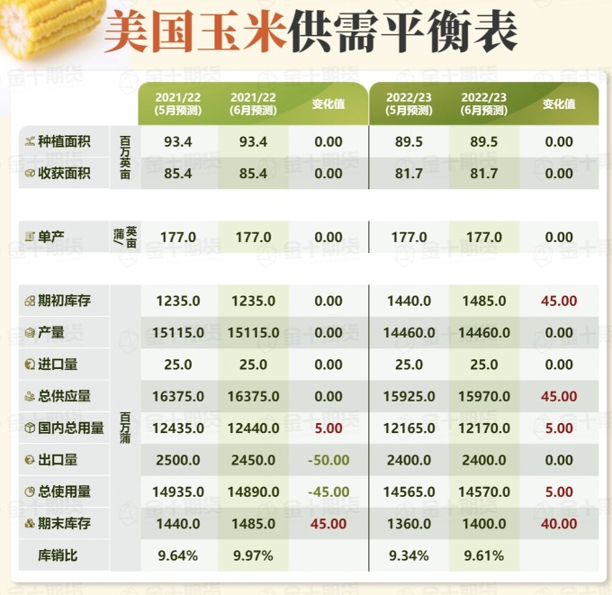 ①6月美国2022/2023年度玉米种植面积预期8950万英亩,5月预期为8950万英亩,环比持平;