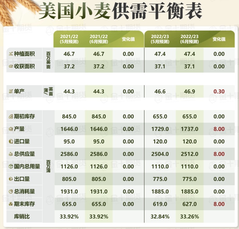 ⑤6月美国2022/2023年度小麦总供应量预期25.12亿蒲式耳,5月预期为25.04亿蒲式耳,环比增加0.08亿蒲式耳;