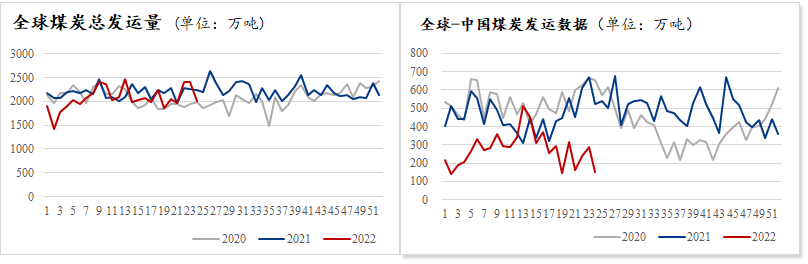 根据Mysteel全球煤炭发运数据显示,本周(6.6-6.12)海上煤炭总发运量为2012万吨,环比降17%。全球发往中国发运量151万吨,环比降48%。