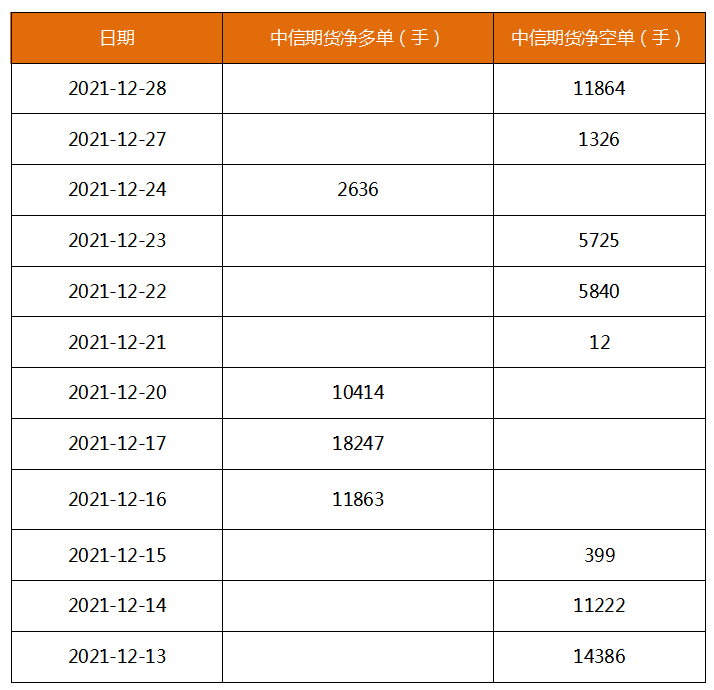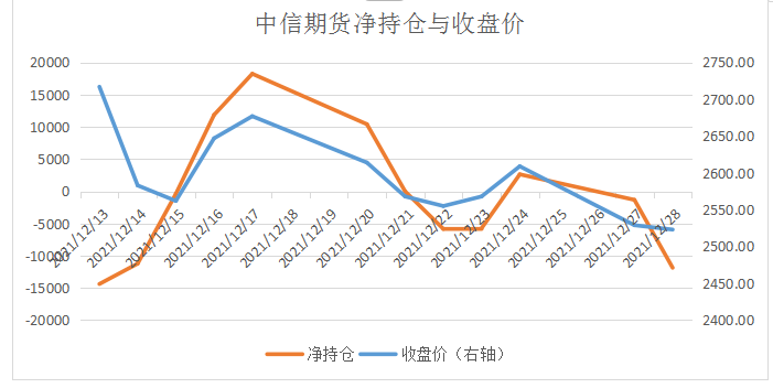综上可知,前20席位整体处于持有净空单超11万手的状态,其中中信期货今日持有净空单超1万手,由其近两周的净持仓状态来看,是处于多空交替的状态,且其昨日再一次完成了多翻空的操作,虽然净空单较少,但今日净空单大幅增加至11864手;再由其收盘价和净持仓走势来看,在12月15日-12月28日期间,二者存在正向相关性,后续可关注其持仓变动情况。