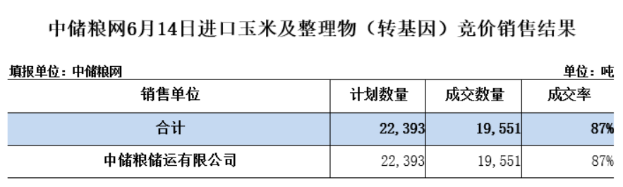 6月14日进口玉米及整理物(转基因)竞价销售结果,实际成交19551吨,成交率87%。