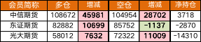 多、空各有2个席位增仓超1万手。此外中信期货和光大期货席位上多、空均增仓。下表列出多单、空单持仓量增加/减少超过1万手的席位。