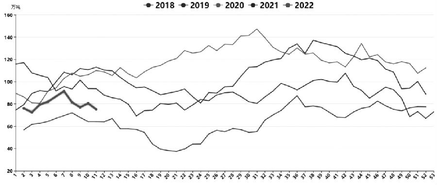 图为2018年至今全国甲醇港口库存周度走势