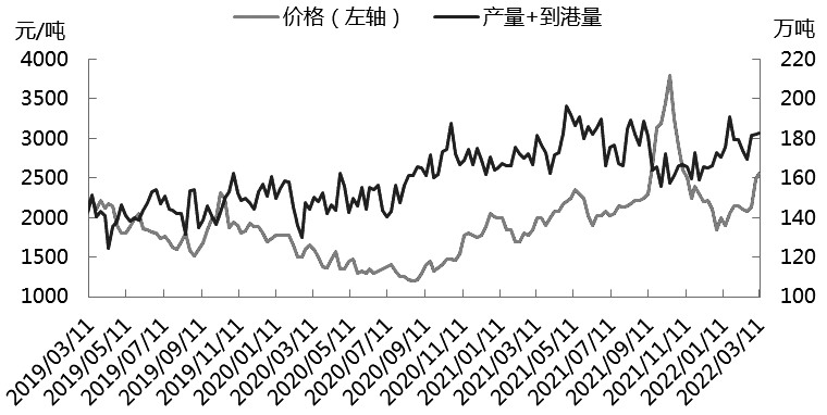 数据显示,截至2022年3月11日,我国甲醇产量与到港量合计在182万吨左右,同比增加0.97万吨,增幅0.53%。近5年以来,我国甲醇供应量稳步提升,目前处于相对偏高位置,虽然后期内地春季检修来临,但短期内对于3月供应量影响有限,多数装置或于4月开始检修。另外,国外装置多数恢复稳定,3—4月进口量环比或增加,初步预估或在90万—100万吨附近。短期来看,甲醇供应面相对充裕。