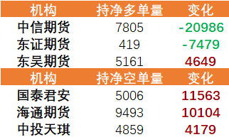 今日净多单变动排名前三的席位分别有中信期货(-20986)、东证期货(-7479)和东吴期货(+4649);今日净空单变动排名前三的席位分别有国泰君安期货(+11563)、海通期货(+10104)和中投天琪(+4179)。